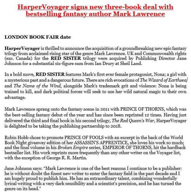 Red Sister Acquisition Announcement from the London Book Fair April 15, 2015 thatthornguy News One comment Rate this:Share this: Click to share on X (Opens in new window) X Click to share on Facebook (Opens in new window) Facebook Click to email a link to a friend (Opens in new window) Email Click to share on Reddit (Opens in new window) Reddit Like Loading... Related
