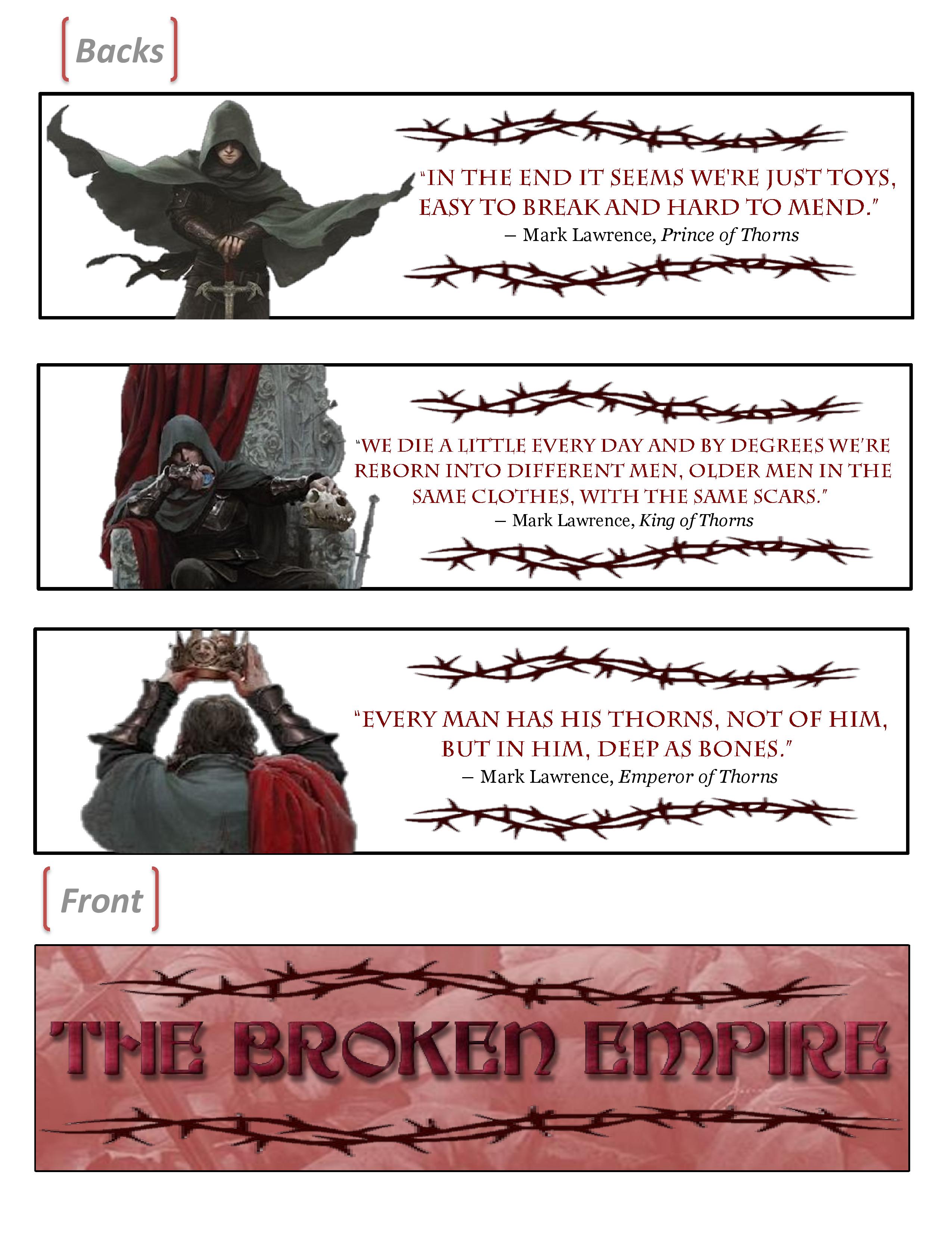This post is to announce a contest in which we’re looking to receive Broken Empire or Red Queen’s War themed bookmarks. Or if you’re feeling specially adventurous you can create one in anticipation of Mark’s upcoming new series featuring a female protagonist, Red Sister, based on the prologue you can find here. There are no special rules as to what materials, pictures etc. you can use, but if you’re using artwork created by someone else, please credit the artist in your entry.